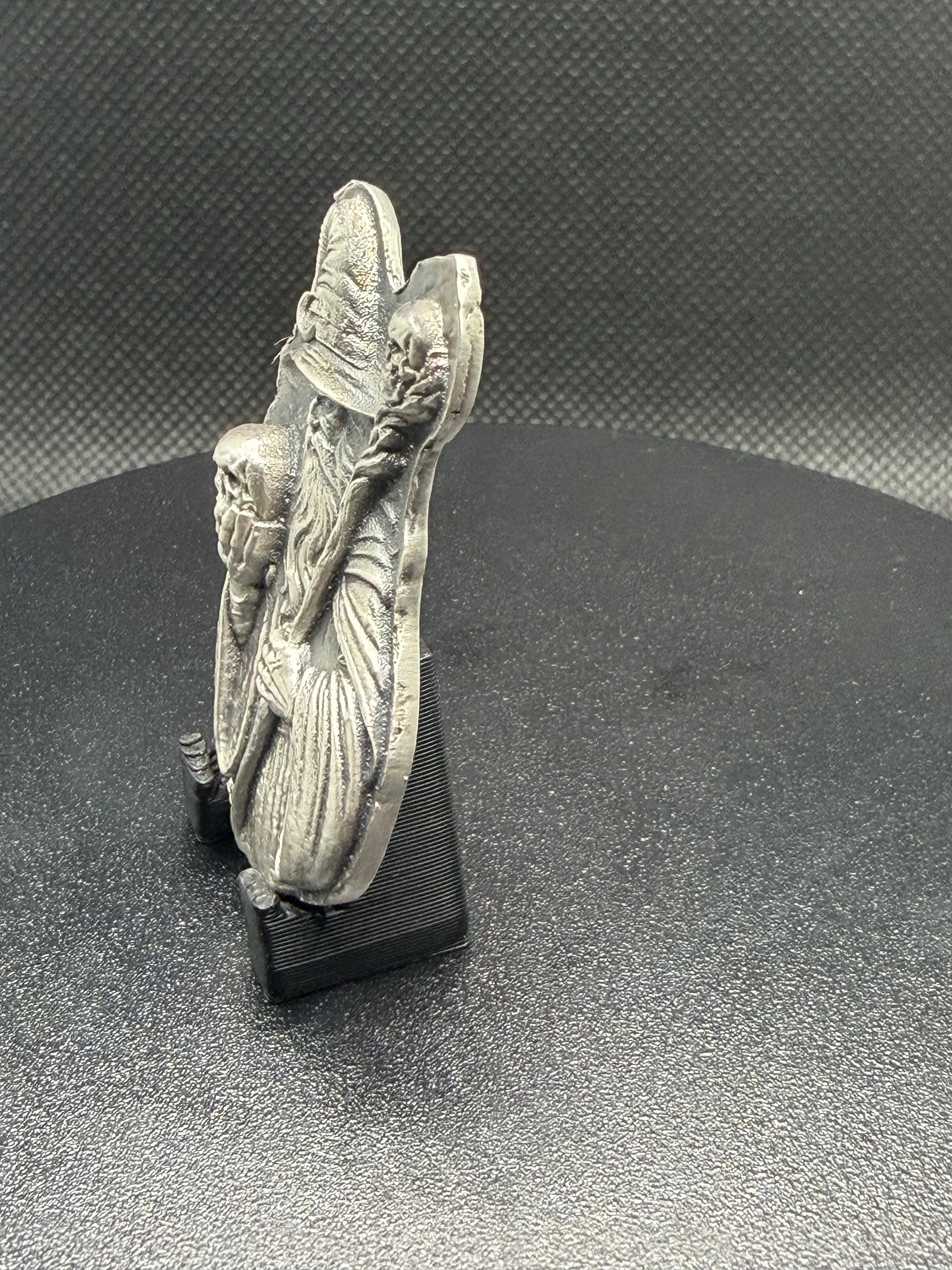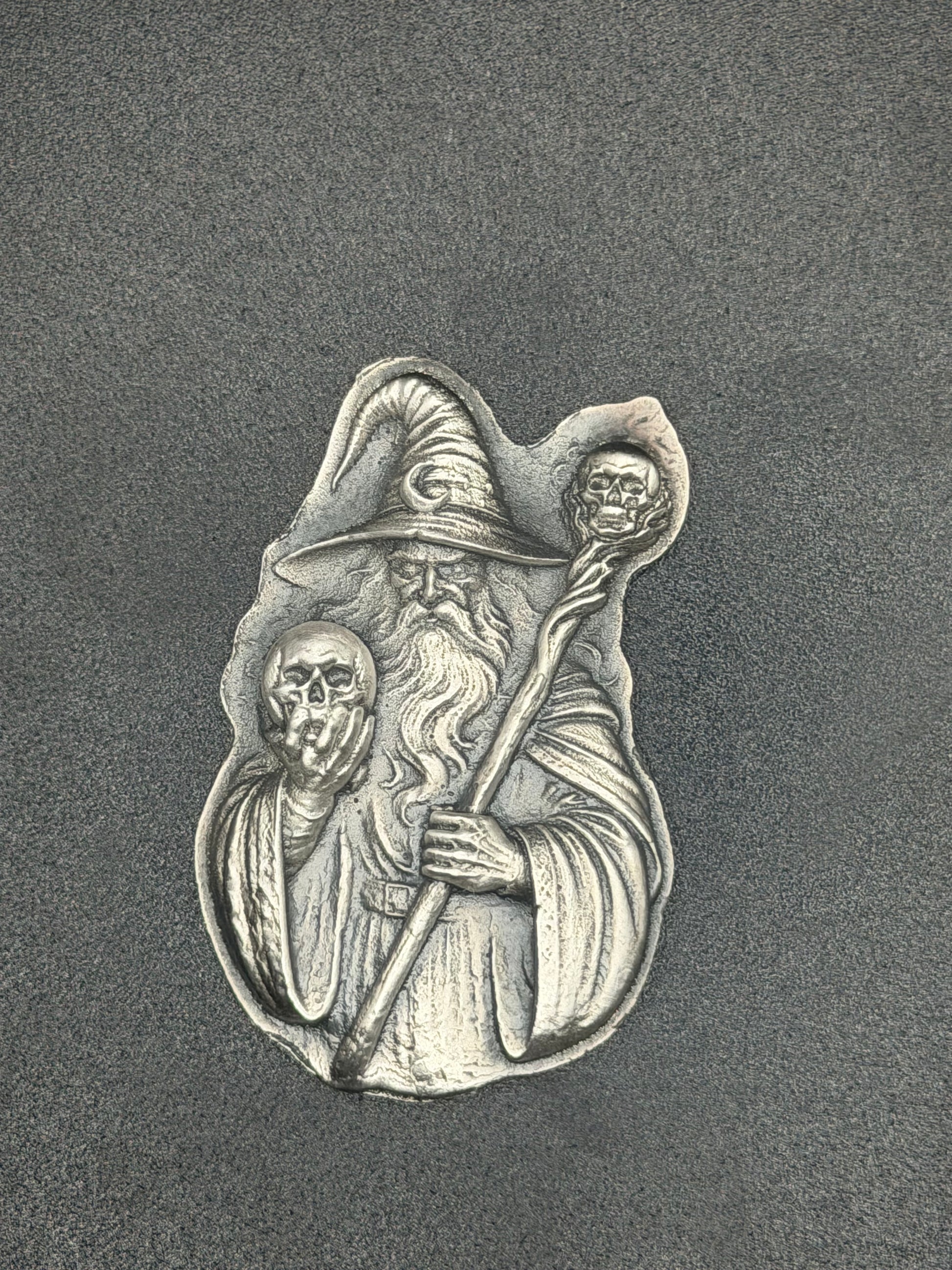 Elevate your silver stack with this intricately detailed, hand-poured wizard. This isn't just bullion; it’s a piece of pocket-sized art. Featuring a grim necromancer clutching a skull and a skull-topped staff, the high-relief strike is enhanced by a deep antiqued patina that makes every wrinkle and bone pop.